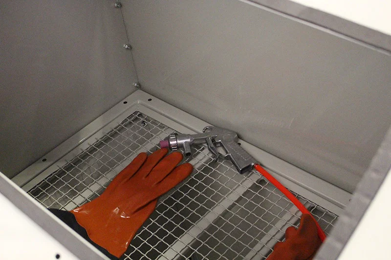 Пескоструйная камера оснащена проверенной системой управления, прочной и емкой камерой с боковыми дверьми, пескоструйным пистолетом, четырьмя керамическими форсунками, перчатками высокого качества, освещением рабочего пространства, большим окном — видоискателем (без мертвой зоны).