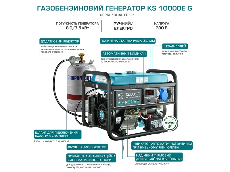 Тип двигателя Бензиновый/газовый 1-цилиндровый, 4-тактный с воздушным охлаждением